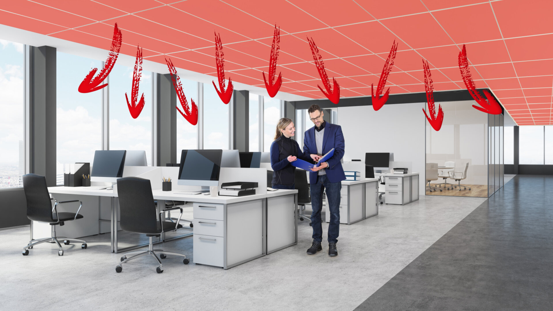 Überdies steigt die warme Luft des Innenraums an die Decke, kühlt sich dort ab und strömt dann vom Deckensystem in den Raum zurück.