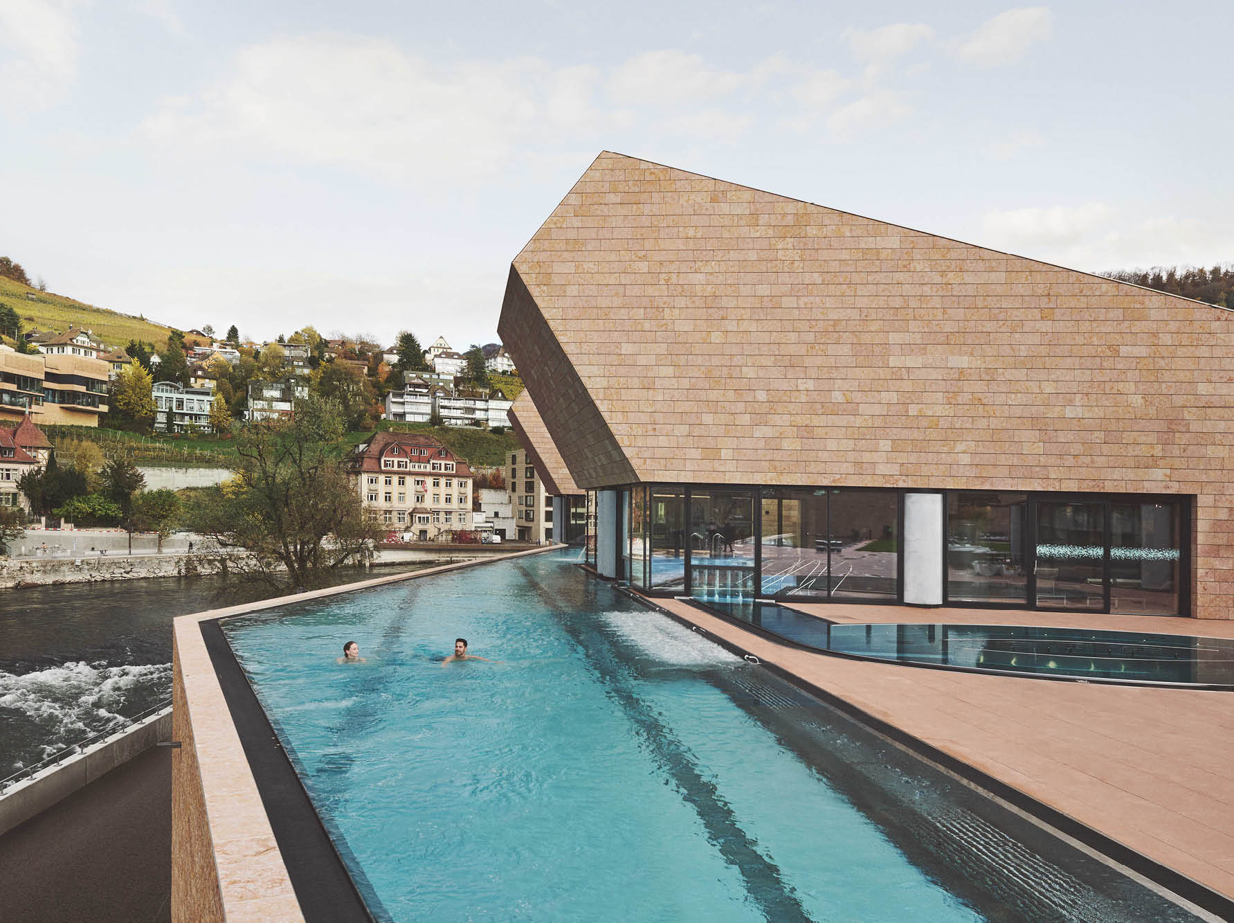 Bereits die Aussenansicht des neuen Wellness-Tempels FORTYSEVEN weckt die Neugierde: Ein 160 Meter langer, in einer Natursteinfassade verpackter Flachbau, gestaltet vom Star-Architekten Mario Botta, wurde im November 2021 eröffnet.