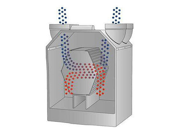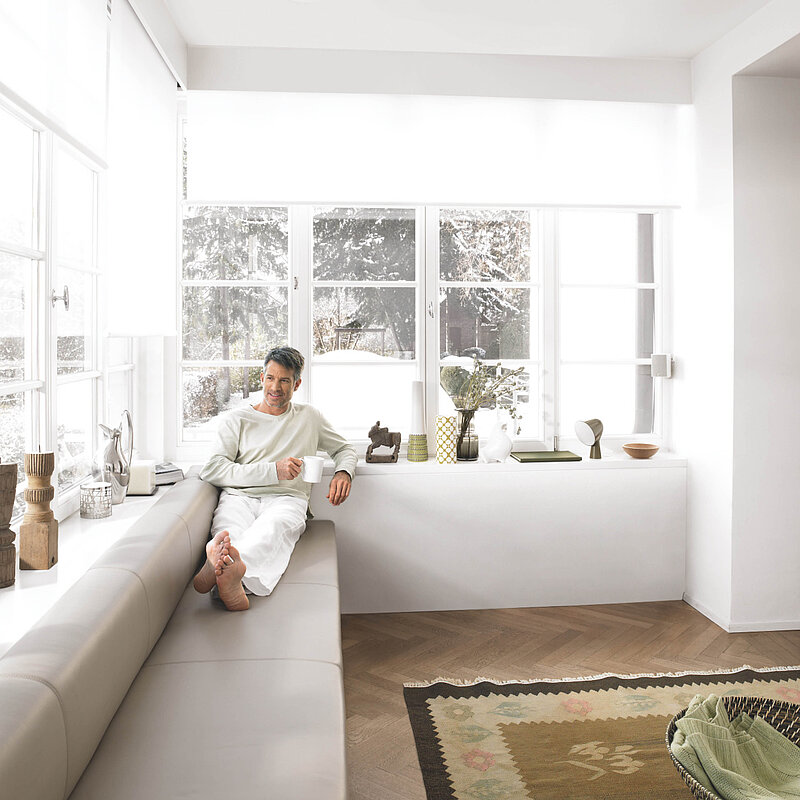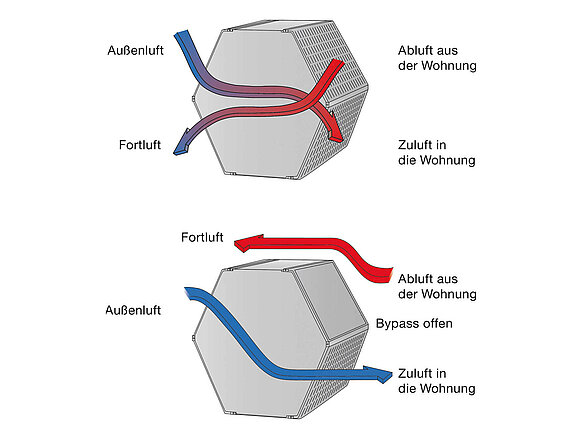 Von aussen gelangt frische Luft ins Haus. Spezialfilter auf Wunsch verhindern das Eindringen von Pollen und vermeiden so allergische Reaktionen. Innen strömt die Luft zum Lüftungsgerät. Das Luftverteil-System leitet sie bedarfsgerecht in die Räume weiter. Gleichzeitig führt das System verbrauchte und zu feuchte Luft zurück nach aussen. Der Clou: Bevor die Abluft wieder ins Freie gelangt, gewinnt ein integrierter Wärmetauscher im Lüftungsgerät etwa 90% Wärmeenergie zurück und gibt diese an die frische Zuluft ab.