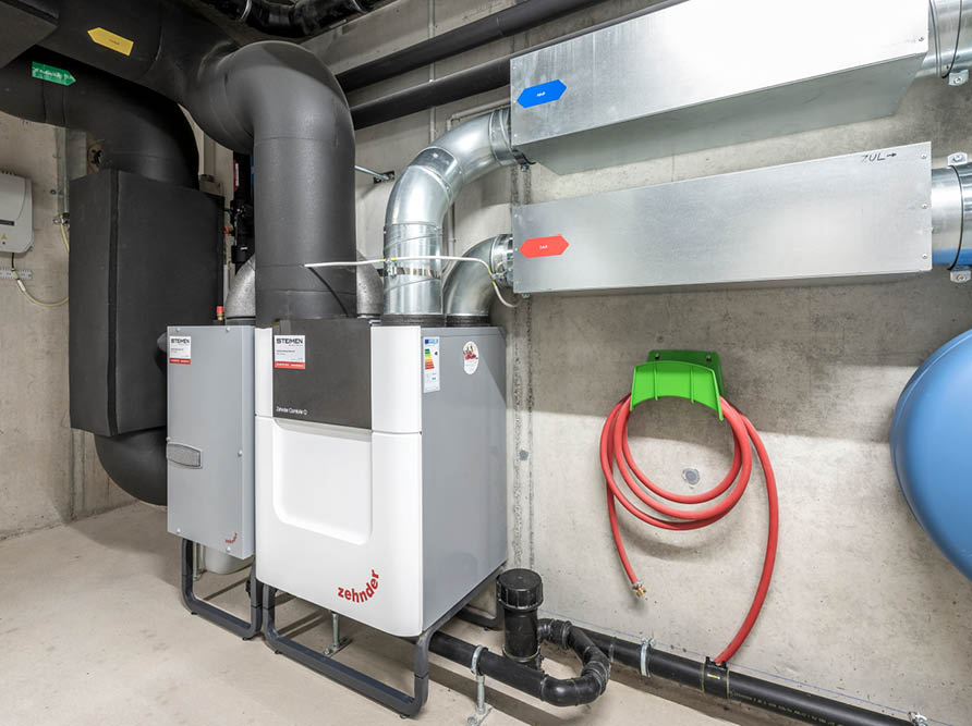 Das Lüftungsgerät, Zehnder ComfoAir Q befindet sich im Keller. Eine Steigleitung mit der Zu- und Abluft verbindet die Wohnungen mit dem Lüftungsgerät. Der Luftaustausch bei der Grundwohnungslüftung funktioniert wie bei einer Komfortlüftungsanlage inklusive Wärmerückgewinnung, was bei reinen Abluftsystemen nicht der Fall ist.