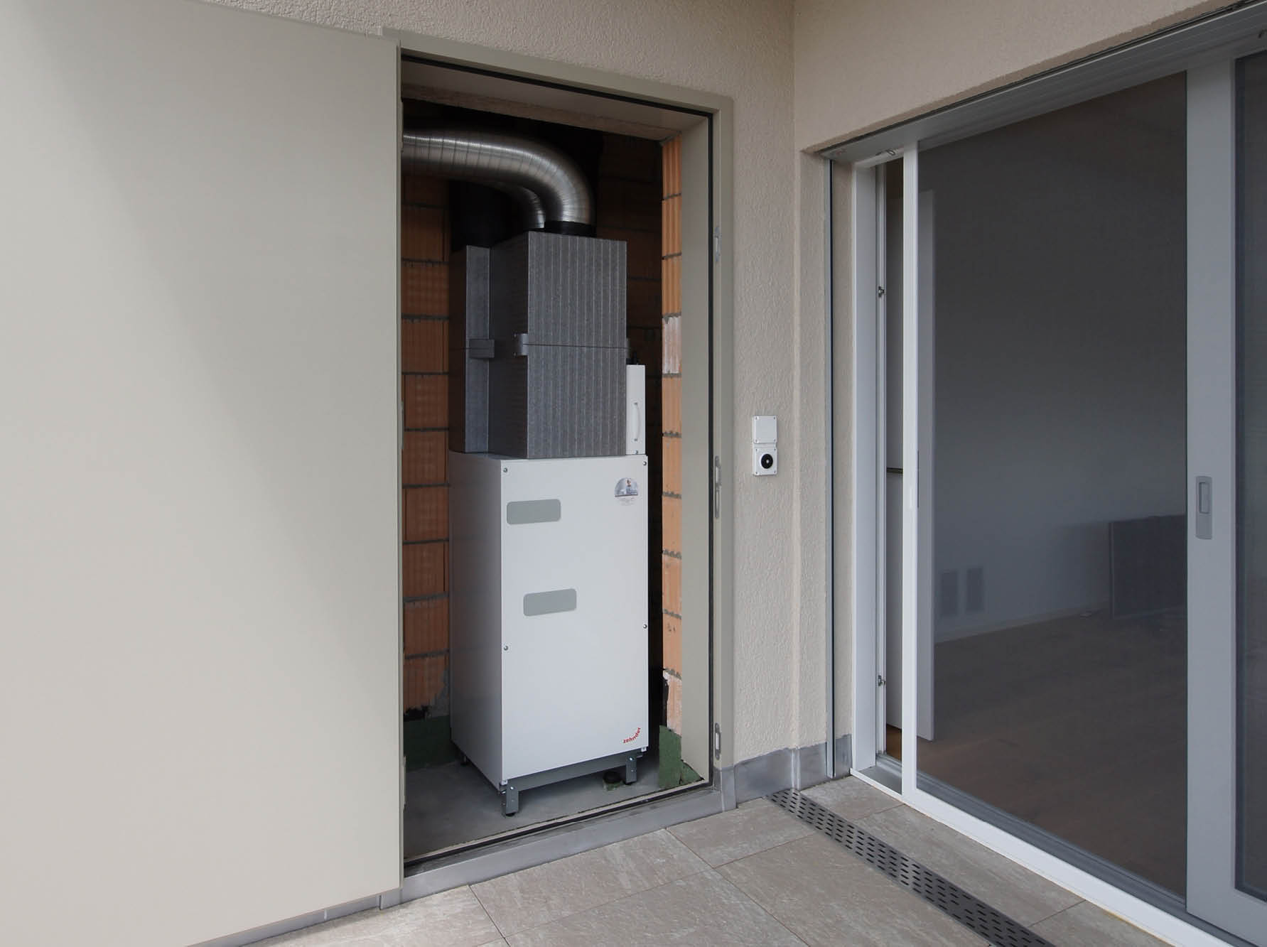 Jede Wohnung verfügt über ein eigenes Lüftungsgerät, das einfach und individuell gesteuert werden kann. Die Lüftung erfolgt nahezu geräuschlos und die Bewohner freuen sich über stete Frischluft ohne die Fenster öffnen zu müssen. Das kompakte Lüftungsgerät hat Platz in einem Einbauschrank und ist leistungsstark und trotzdem sehr leise.