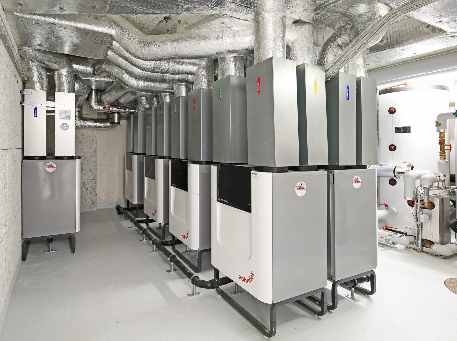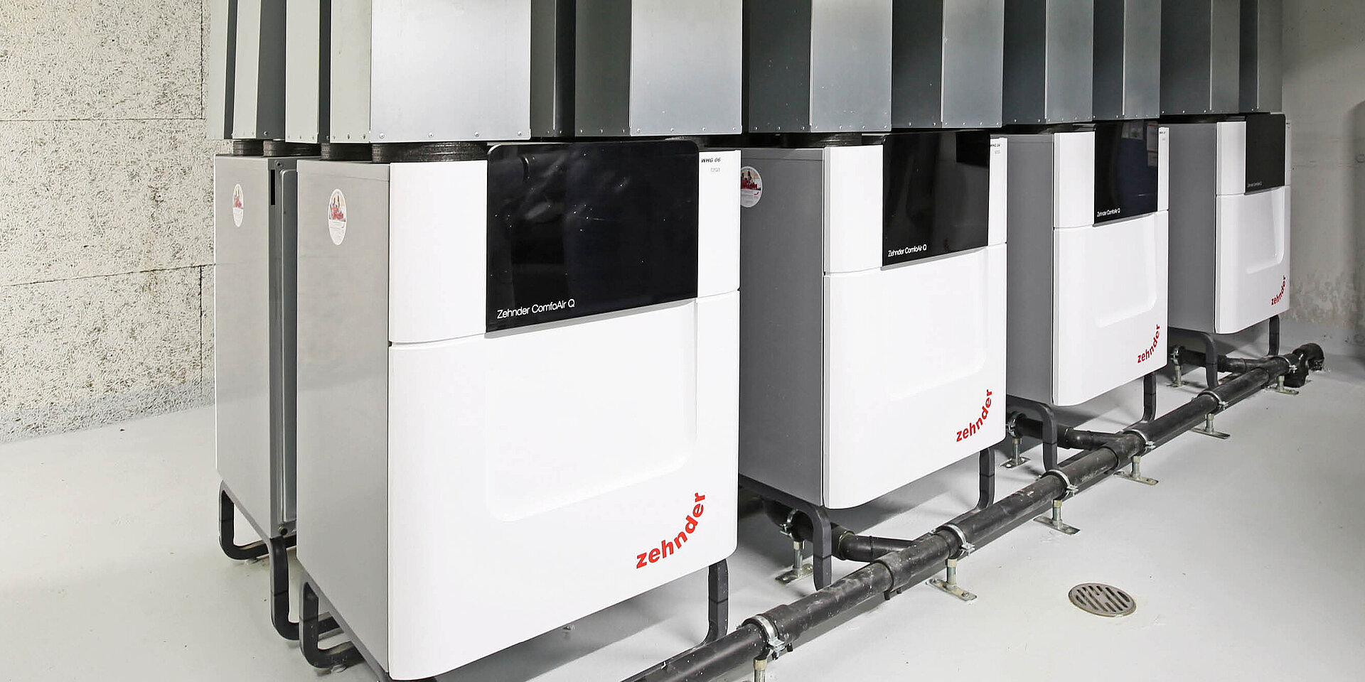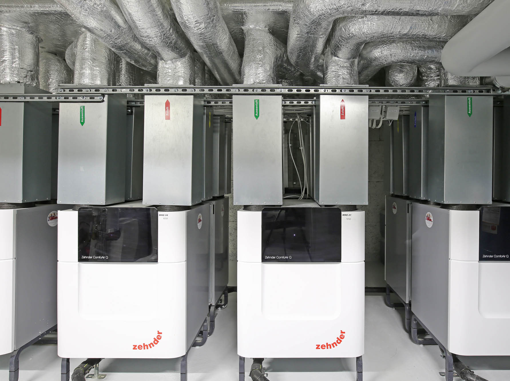 Die Aussenluft wird an der Fassade im ersten Obergeschoss gefasst und von dort in den Technikraum im Souterrain geführt. Dort versorgen zehn Komfortlüftungsgeräte Zehnder ComfoAir Q die Wohnungen konstant mit Frischluft.