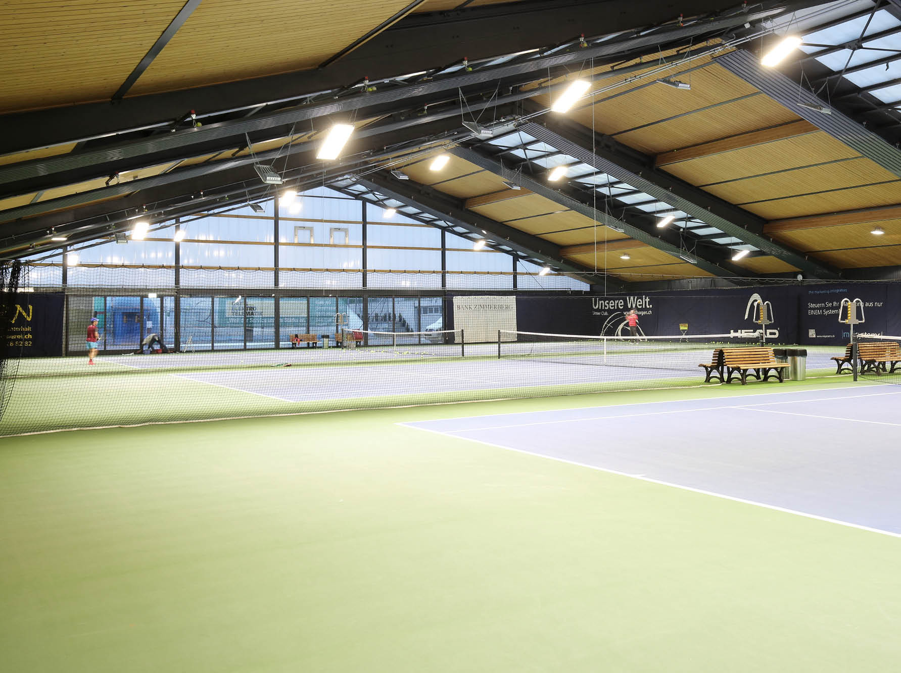 Auch wenn es draussen schneit, herrschen drinnen konstant für den Spielbetrieb optimale 18°C ohne Zuglufterscheinungen. Erreicht wird dies durch besonders energieeffiziente Zehnder ZBN Deckenstrahlplatten.