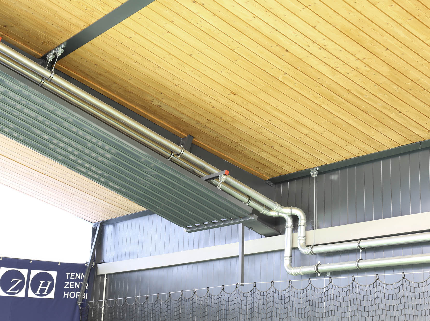Mit einer maximalen Innenhöhe von 15 Metern unter dem mittig verlaufenden Giebel beinhaltet der Indoor-Bereich des Tenniszentrums Horgen eine enorme Luftkubatur. Die Hallen wurden bisher mit drei Lufterhitzern erwärmt. Dabei stieg die Hallentemperatur an kalten Tagen kaum über 12°C, was selbst in einer Sporthalle relativ frisch ist.
