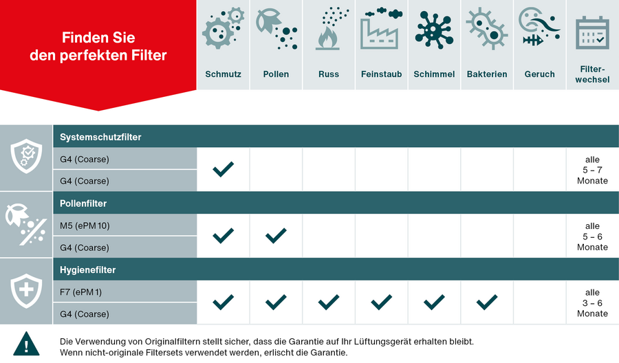 Durch die Verwendung von Zehnder-Originalfiltern verlängern Sie zudem die Lebensdauer Ihrer Lüftungsanlage, verringern den Wartungsbedarf und sorgen dafür, dass Ihr System über Jahre hinweg reibungslos funktioniert.