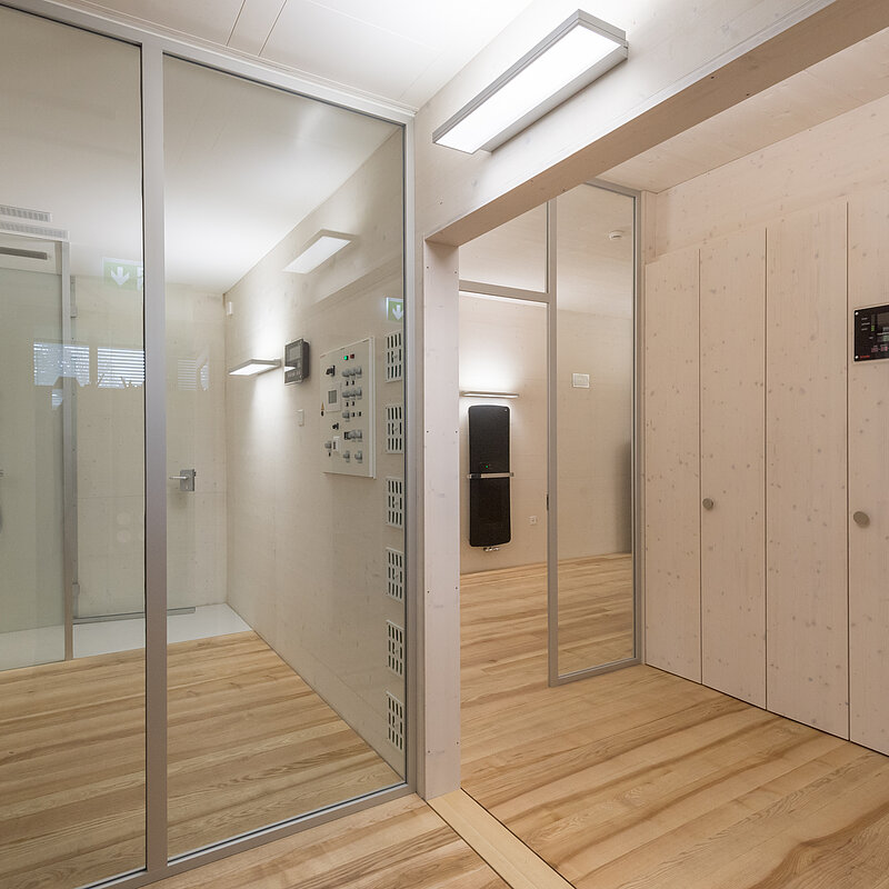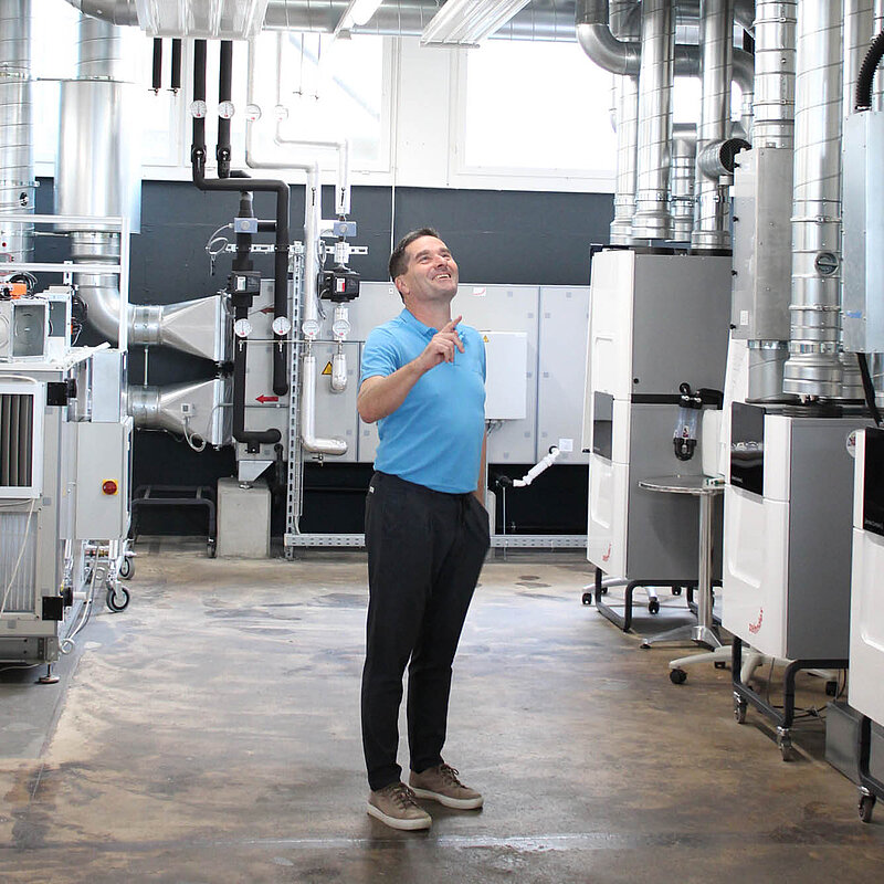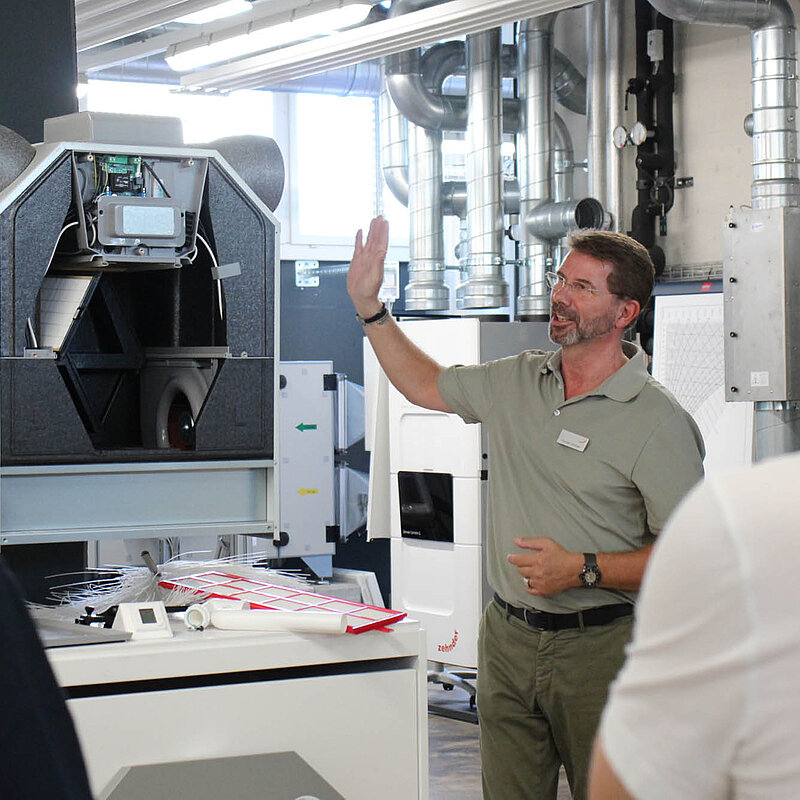 Ein ganz neues Lernerlebnis erfahren die Kursteilnehmer dank der Raumklima-Infrastruktur «ComfoClimate»: Die sogenannten Klima-Räume bieten das praktische Erleben von Raumklima und das Lernen «mit allen Sinnen», wie beispielsweise das Zusammenwirken von Heizkörper, Komfortlüftung, Kaskadenlüftung, Cheminéeofen und Dampfabzug. Genauso kann man die unterschiedliche Luftbewegung von Heiz- und Kühlflächen bei Strahlung oder Konvektion erleben. Durch den Einsatz von Zehnder ComfoAir Q Lüftungsgeräten mit der Enthalpietauscher-Technologie ist es erstmals möglich, den Feuchteübertrag zwischen zwei Raumklimazonen zu visualisieren. Das interessierte Fachpublikum kann also im «ComfoClimate» Bereich hautnah unterschiedliche Raumklima-Technologien erleben und spüren.