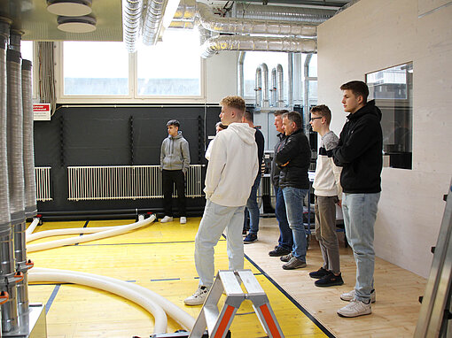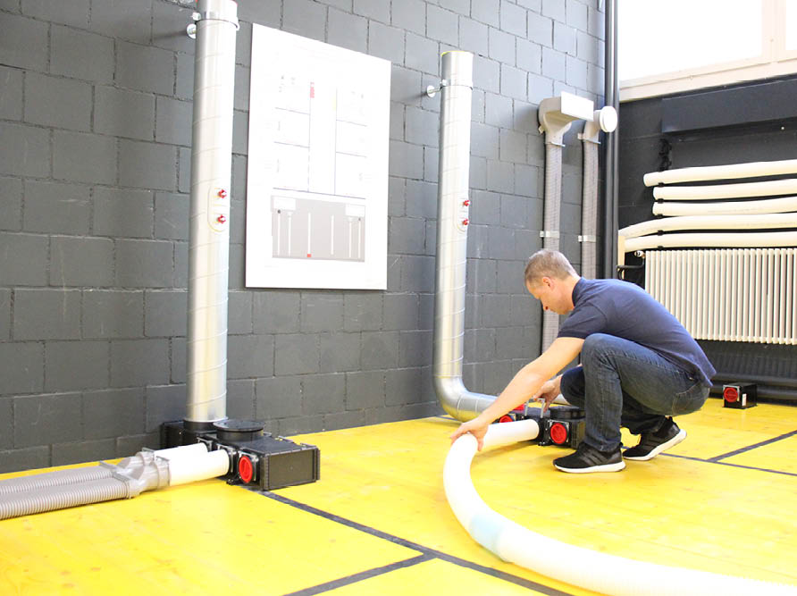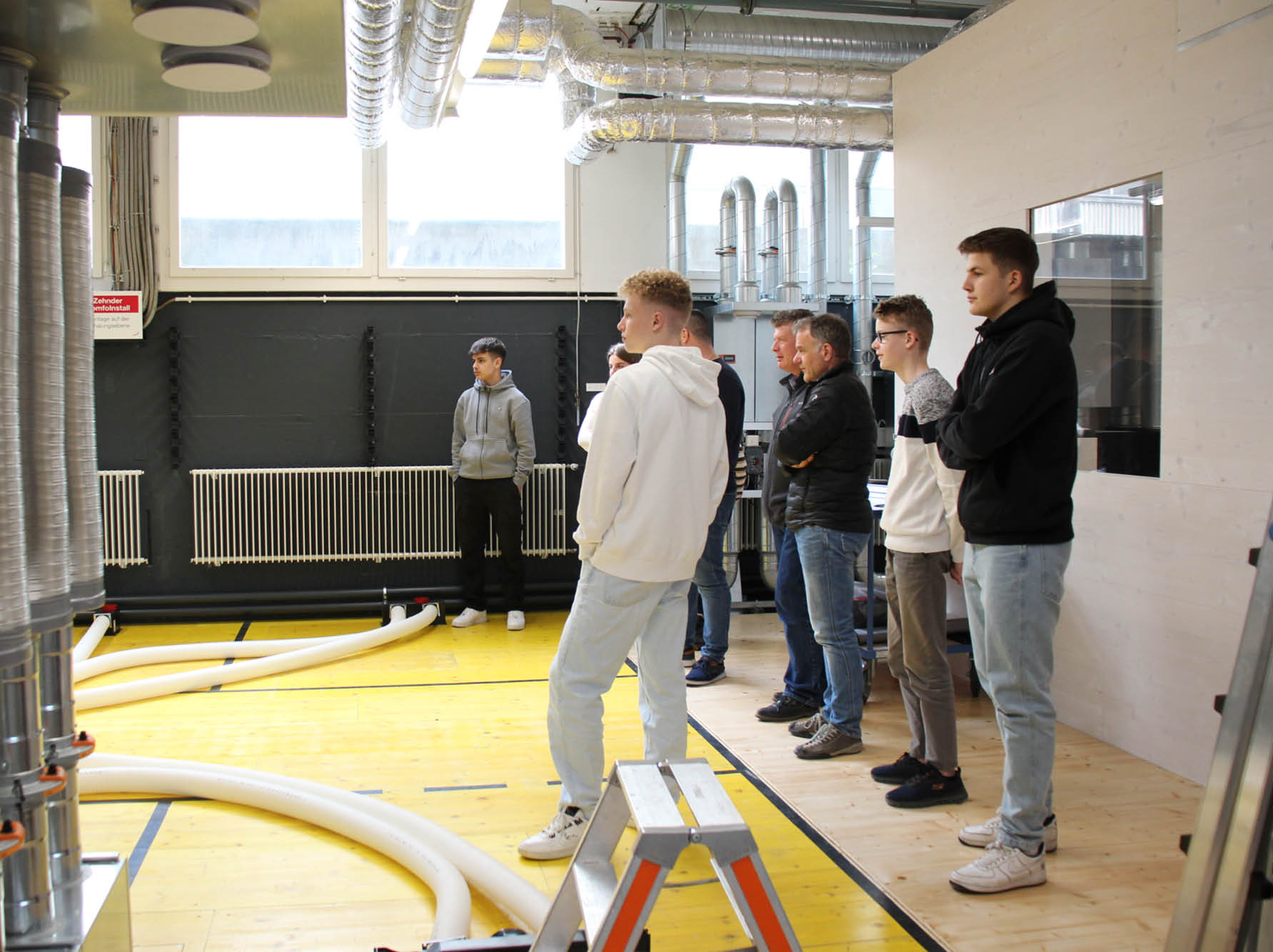 Auf der nachgebauten Schalungsebene stehen den Kursteilnehmenden alle Luftverteilkomponenten einer Komfortlüftung zur Verfügung. So kann vor Ort ein Luftverteilsystem aufgebaut und veranschaulicht werden. Während der Praxisübung werden den Teilnehmenden viele praktische Hinweise für die Installation mitgegeben.