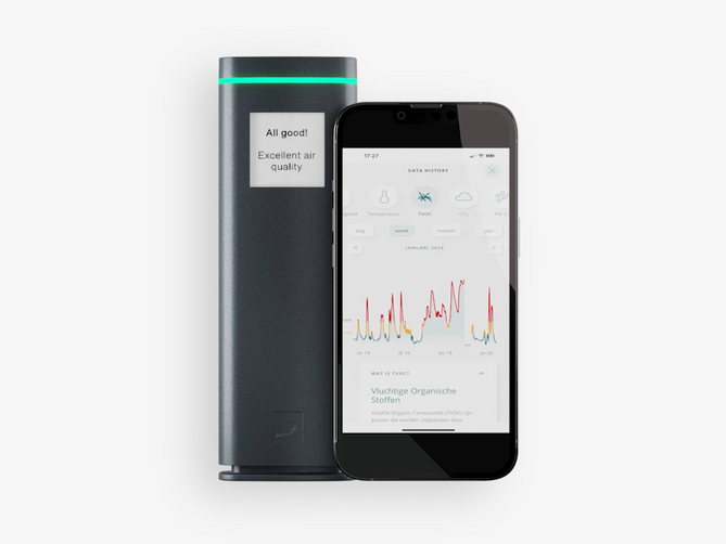 L'humidité de l'air, le CO2, la température, les particules fines (PM10 et PM2.5) ainsi que les vapeurs et les gaz (TVOC) influencent la qualité de l'air ambiant 24 heures sur 24. Le nouvel Airdentifier de Zehnder rend ces impacts visibles : il mesure en continu les principales émissions dans n'importe quelle pièce au moyen de six capteurs intégrés. L'appareil maniable et mobile (5,5 x 3,5 x 16,6 cm) vous signale à tout moment l'état de la qualité de l'air ambiant grâce à son anneau de LED de couleur et à son écran énergétiquement performant. L'Airdentifier peut fonctionner jusqu'à six heures sans fil. L'application correspondante offre un aperçu en temps réel de la qualité générale de l'air, donne des conseils pour un climat ambiant plus sain et fournit des données historiques détaillées.