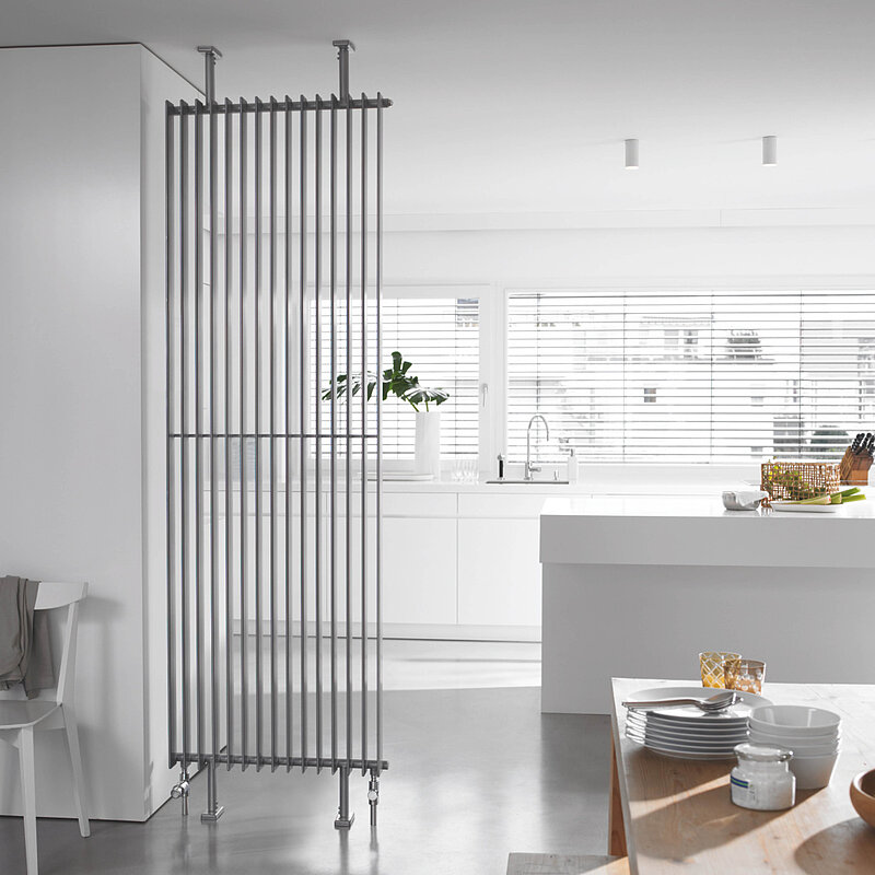 Comme éléments de séparation, les corps de chauffe Zehnder forment un paravent transparent sans faire perdre à la pièce son volume.