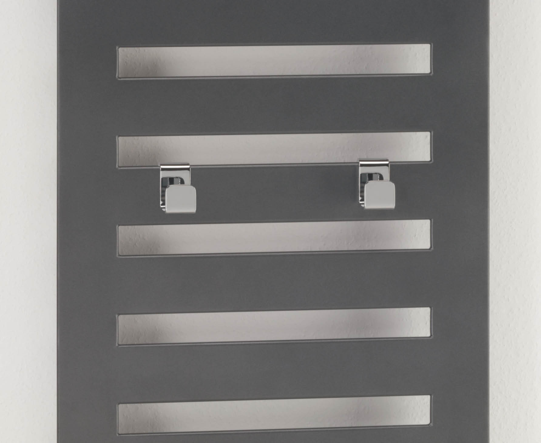 Version de haute qualité en acier, chromée ou dans la teinte du corps de chauffe, avec fixation à deux points dissimulée derrière le corps de chauffe; capacité de charge max. 10 kg.