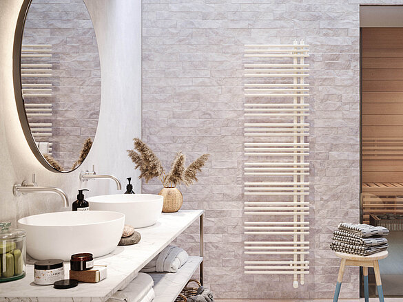 Une esthétique et une fonctionnalité de qualité supérieure. Avec ses tubes verticaux placés à gauche ou à droite, Zehnder Yucca Asym crée une impression de légèreté dans la salle de bains. Il permet de glisser facilement les grandes serviettes sur un côté. Ce corps de chauffe design peut également être utilisé comme claustra. Ce corps de chauffe est disponible dans presque toutes les teintes et finitions du nuancier Zehnder.