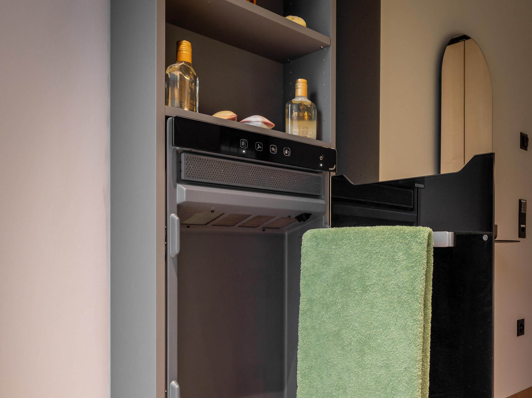 Nina Suma explique: «La construction était déjà bien avancée lorsque nous avons choisi l’unité de chauffage de confort Zehnder Zenia. En effet, contrairement à la plupart des produits concurrents, Zehnder Zenia existait également en version pour installation encastrée. Et même dans cette version, Zenia occupe peu d’espace et de surface au sol, grâce à ses dimensions très compactes. Autres points positifs à mes yeux: les performances et la simplicité d’utilisation de l’unité. Elle s’allume facilement et chauffe serviettes ou draps de bain à une température agréable en un rien de temps.»