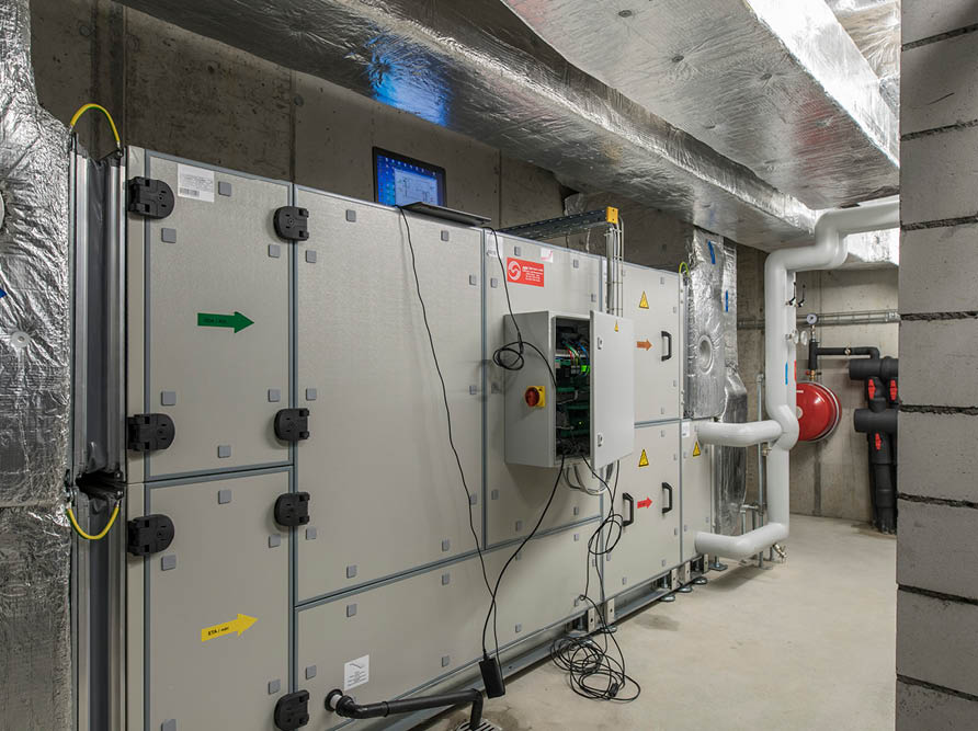 L’appareil de ventilation grand volume placé à la cave peut, grâce à sa construction modulaire, être adapté aux besoins réels du projet. Il est doté de nombreuses fonctions intelligentes et innovantes. L’air neuf est prétempéré par la pompe à chaleur avec sondes géothermiques, qui commande le fonctionnement d’une batterie de post-chauffage. La récupération de chaleur de l’air vicié s’élève à environ 90 %. Pour les journées d’été particulièrement chaudes, l’appareil dispose d’un by-pass en standard.