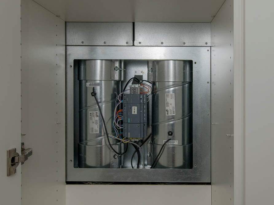 L’alimentation en air de chaque habitation s’effectue via des caissons de ventilation de l’air ambiant insonorisés de type Zehnder ComfoVar. Ceux-ci régulent l’apport d’air neuf et ne nécessitent qu’un espace restreint dans les différents logements. Les habitants peuvent sélectionner confortablement l’intensité de ventilation à l’aide d’un interrupteur à trois positions