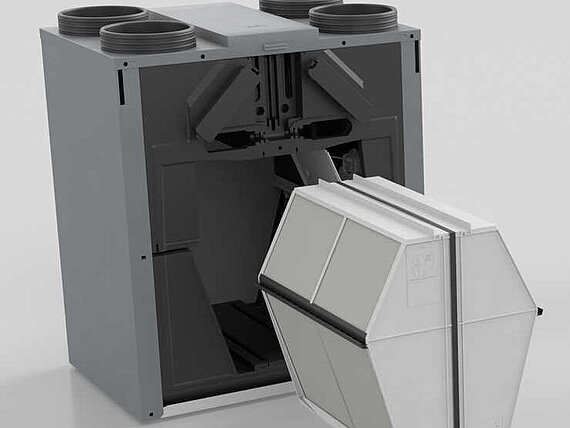 L’échangeur de chaleur intégré à l’appareil de ventilation garantit que l’air, même s’il est froid à l’origine, arrive préchauffé dans les pièces à vivre. En été, cet échangeur peut être contourné.