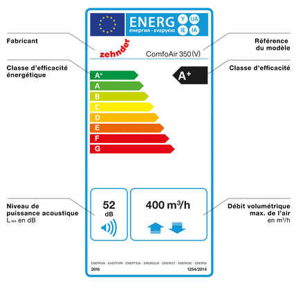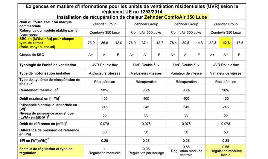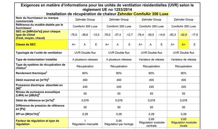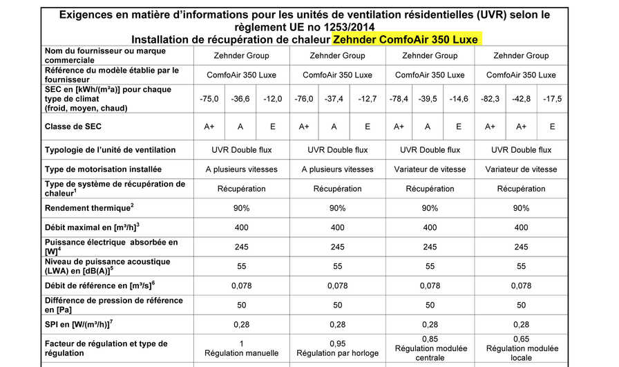 A titre d’exemple: Zehnder ComfoAir 350 Luxe avec capteur de CO2, tempéré, donc valeur intermédiaire: classe énergétique A+