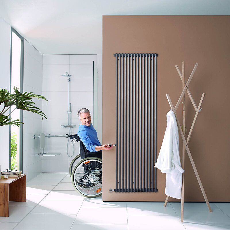In una nuova costruzione, come in una ristrutturazione, l’allestimento della stanza da bagno deve soddisfare varie esigenze e offrire sufficiente comfort anche nelle fasi di vita future: docce senza barriere a filo pavimento con maniglie di sostegno adeguate, WC con doccia, lavabi confortevoli e corpi riscaldanti da bagno con altezza di utilizzo ottimale.