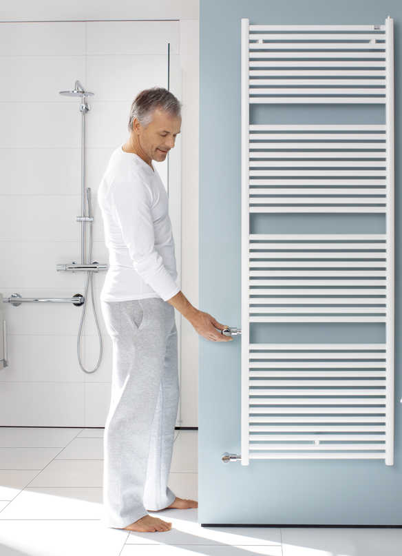 L’attacco laterale con termostato posto a un’altezza comoda può essere montato su numerosi modelli di corpi riscaldanti da bagno e anche su quelli realizzati a misura (ad es. Zehnder Charleston da 2 a 6 colonne a partire da un’altezza di 1200 mm).