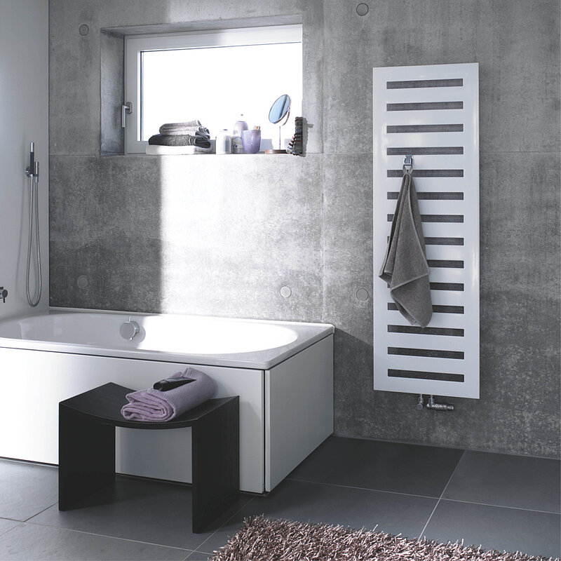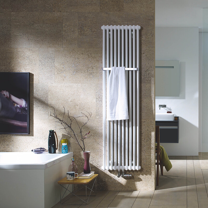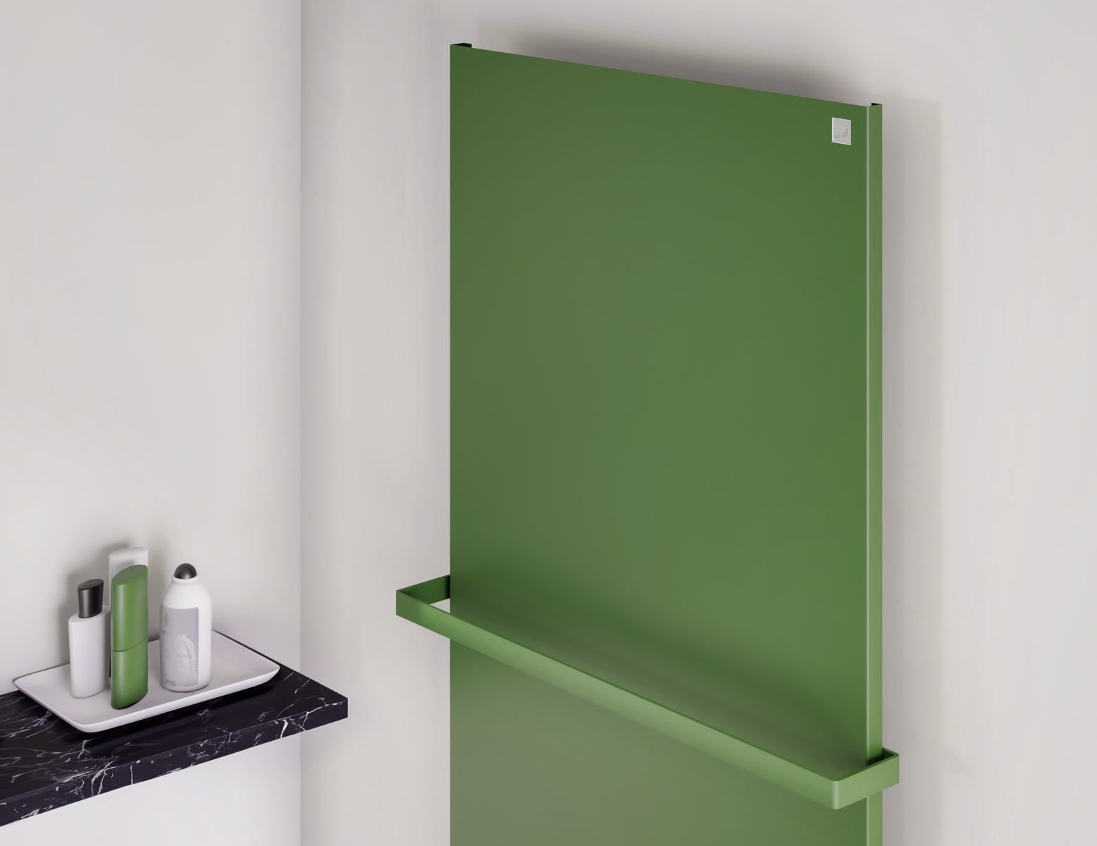 Versione pregiata in acciaio, cromato o nel colore del corpo riscaldante, con fissaggio a 2 punti nascosto dietro il corpo riscaldante; capacità di carico max. 10 kg.