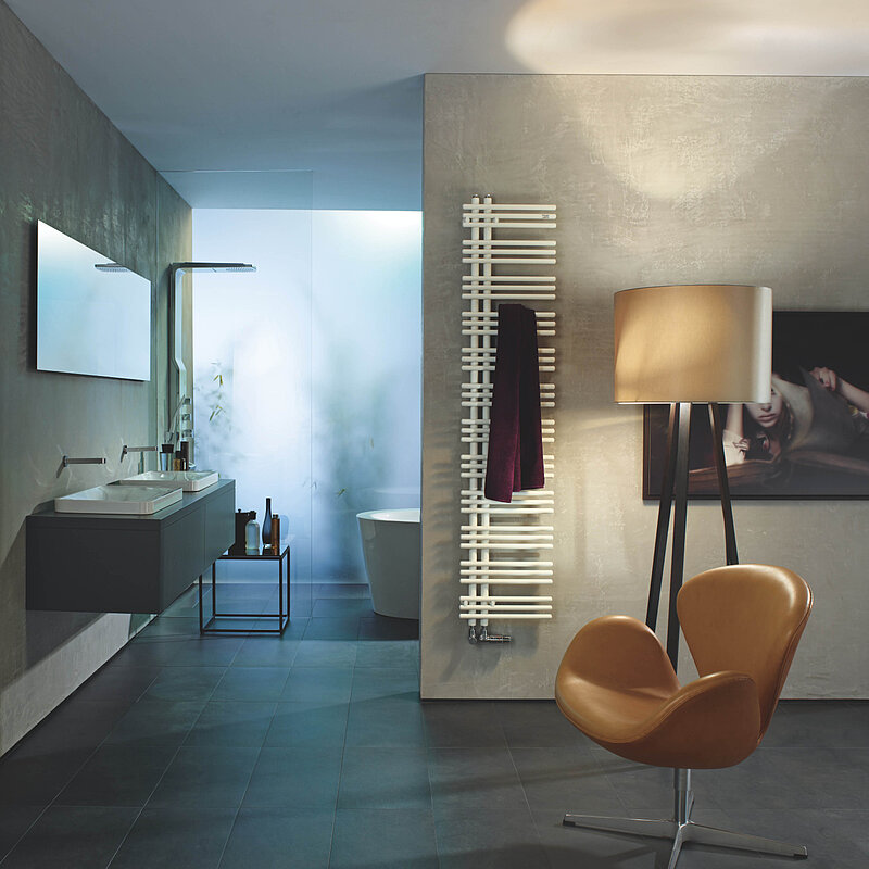 Zehnder Yucca convince in tutte le varianti di modello come elemento architettonico peculiare in bagno, in versione simmetrica, asimmetrica o con elegante mascherina.