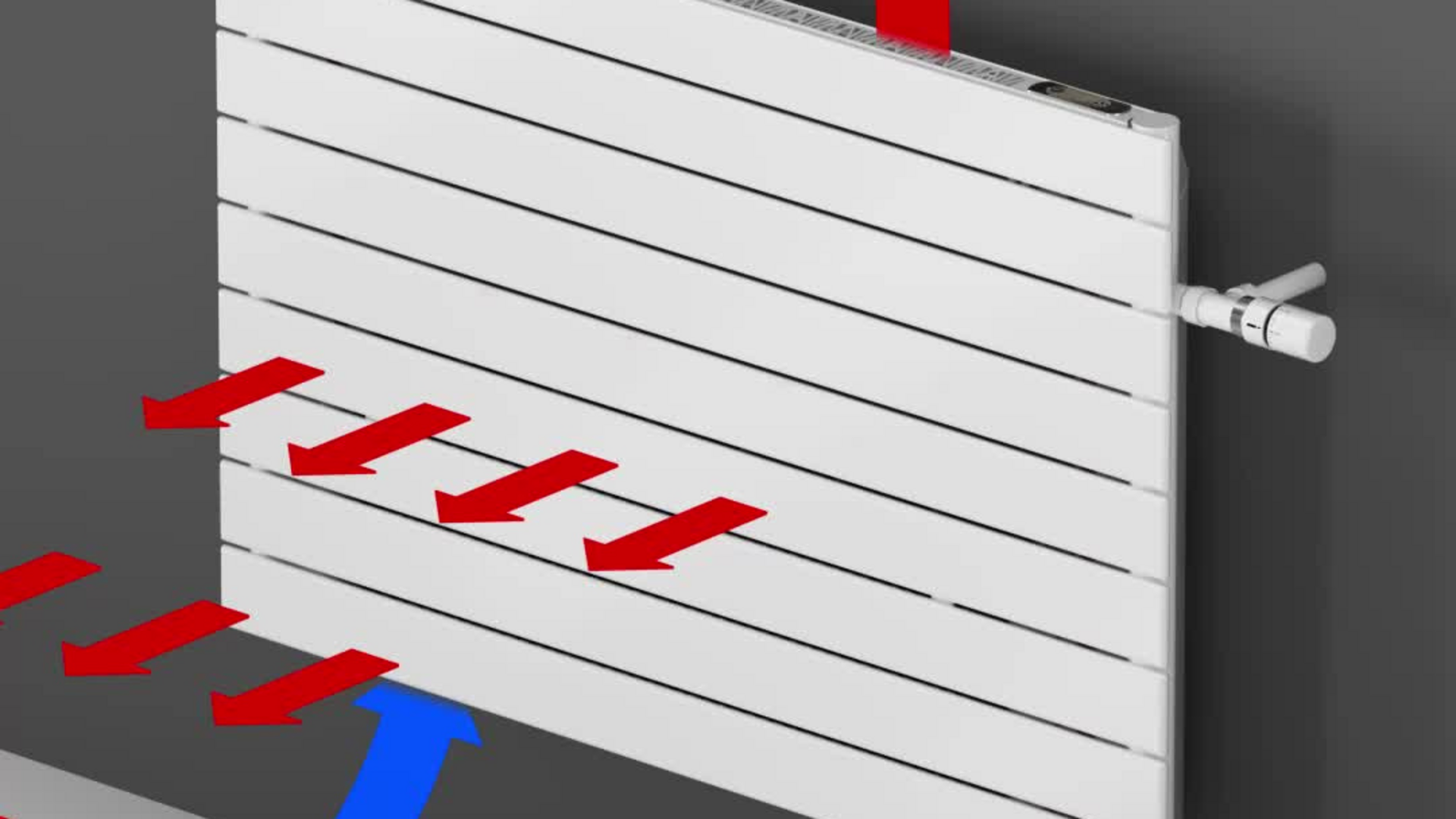 La trasmissione del calore nell'ambiente avviene tramite corpi riscaldanti, riscaldamento a pavimento, pannelli radianti a soffitto o TABS. Si applica quanto segue: Più ampia è la superficie, più calore o freddo possono essere trasmessi. La trasmissione avviene per convezione (aria riscaldata o raffreddata) o per irraggiamento (radiazione elettromagnetica).