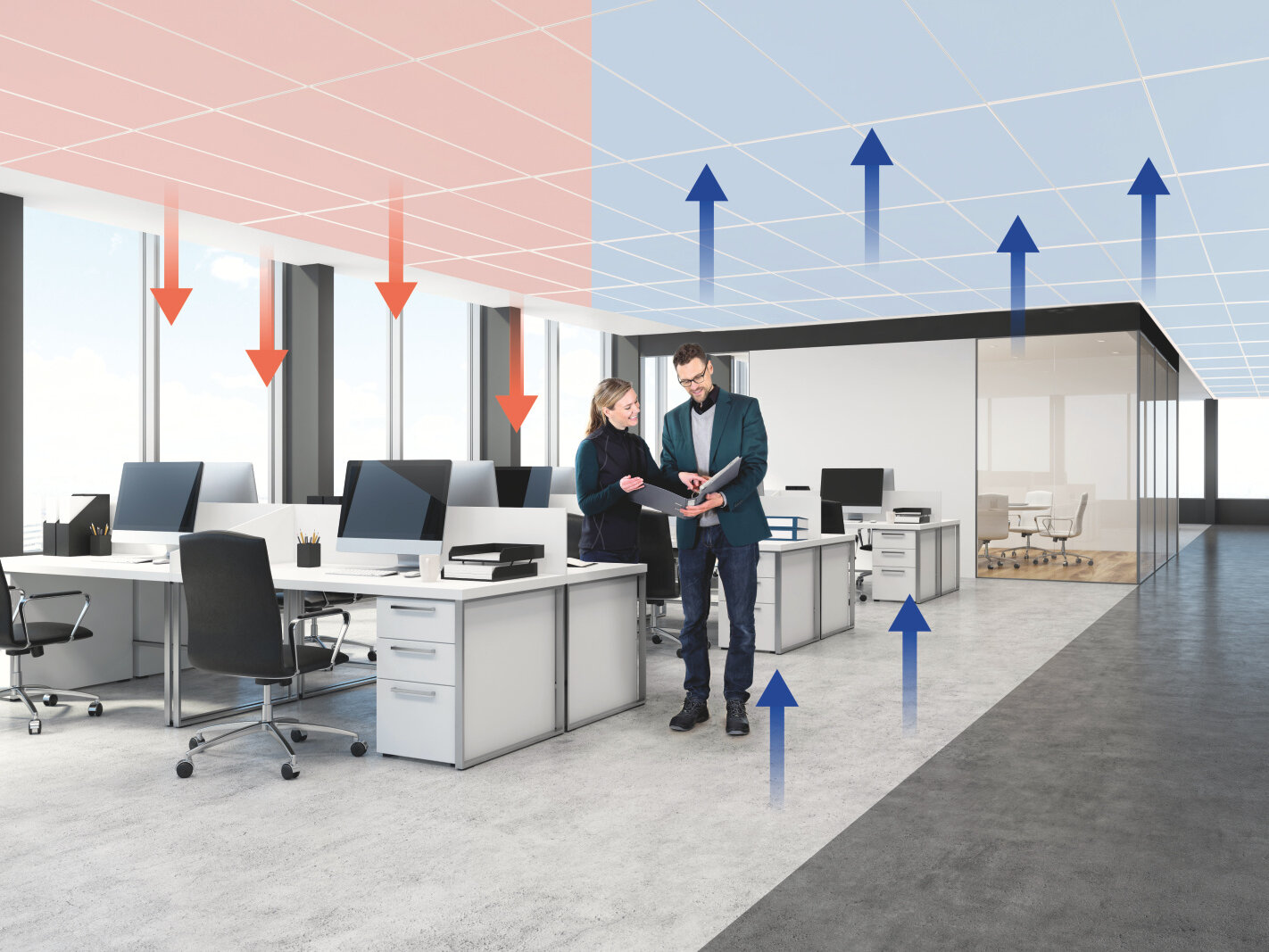 I pannelli radianti a soffitto sono un metodo efficace di raffrescamento, particolarmente vantaggioso in combinazione con una pompa di calore. L'energia termica esistente negli ambienti interni viene trasferita al pannello radiante a soffitto o al fluido di trasferimento termico freddo (acqua) nel pannello. Questa energia viene poi rilasciata nell'ambiente attraverso la pompa di calore. I pannelli radianti a soffitto sfruttano il calore/raffrescamento radiante per garantire un clima ambientale uniforme e gradevole, senza movimenti d'aria fastidiosi. Poiché i pannelli radianti a soffitto sono spesso utilizzati su ampie superfici, questo sistema è potente e molto efficiente, sia per il raffrescamento che per il riscaldamento.