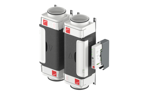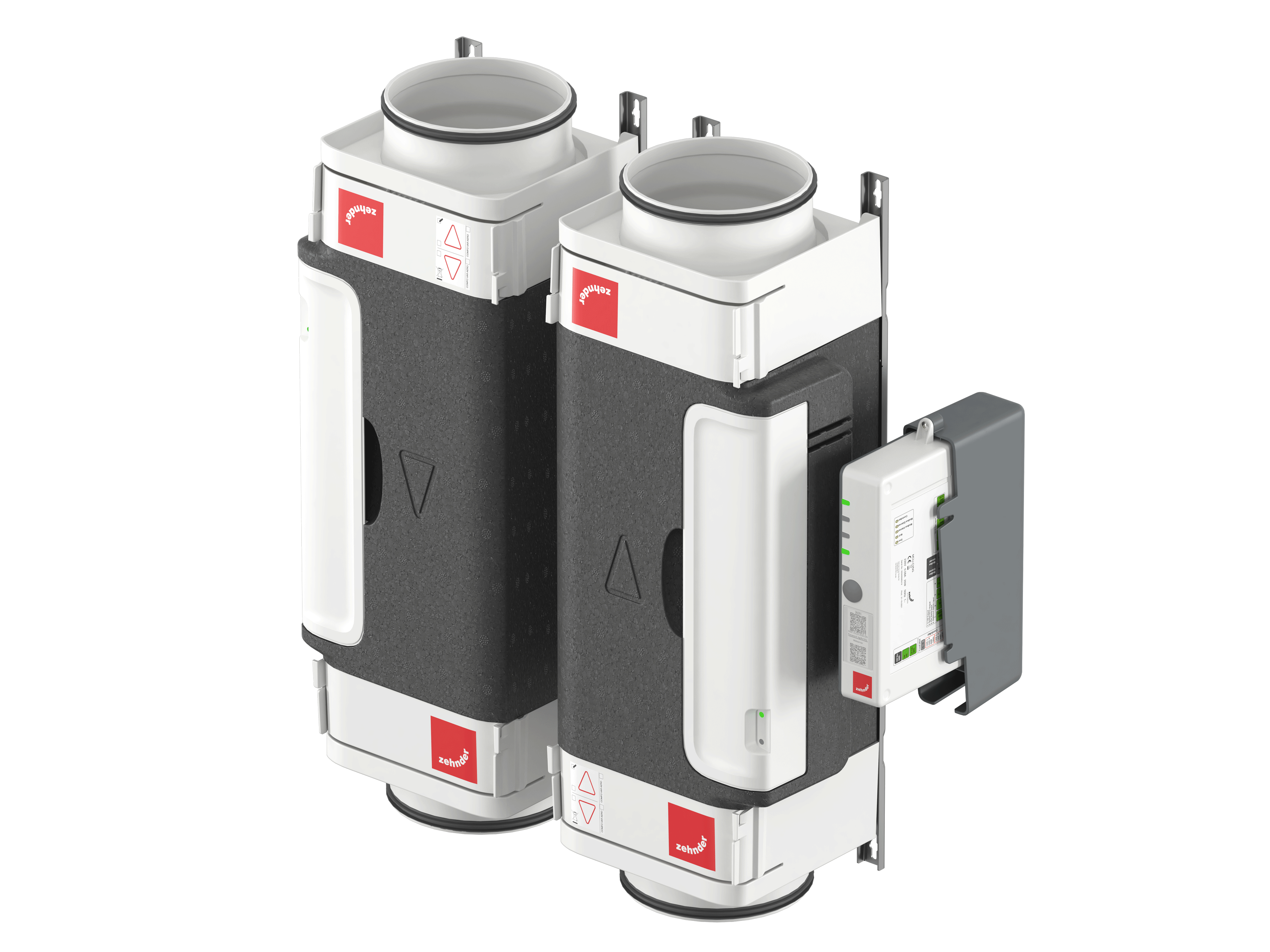 Il box di ventilazione dell’abitazione Zehnder ComfoVar Aero controlla l’aria di mandata e l’aria aspirata che entra in casa da un’unità di ventilazione centrale di grandi dimensioni in base alla domanda, occupa pochissimo spazio ed è flessibile da installare.